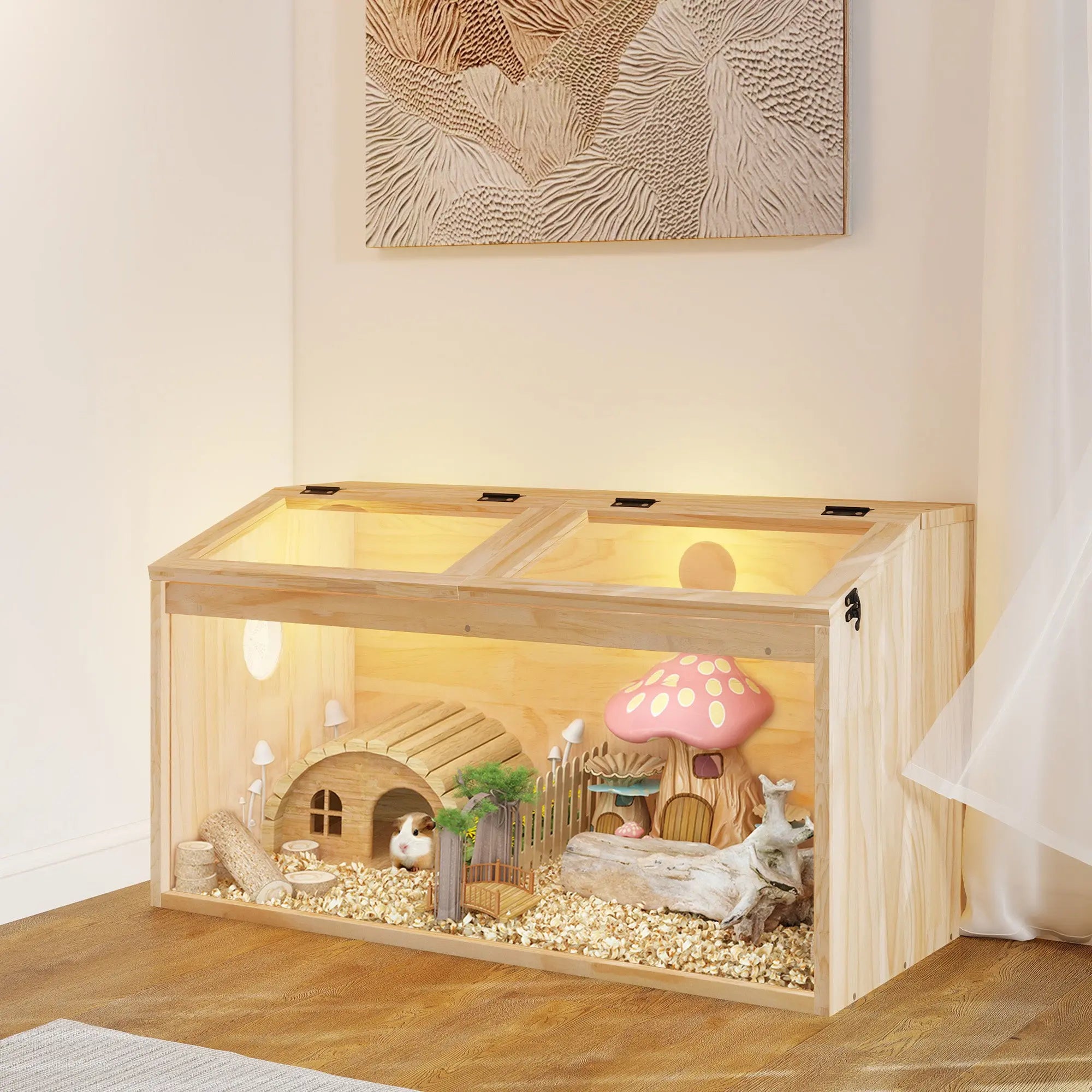 We searched and searched and this is a large space for our hamster but it gives a more natural feel without all the metal and plastic. This has kept our sweet hamster safe from the cat and it has been very sturdy and well made.