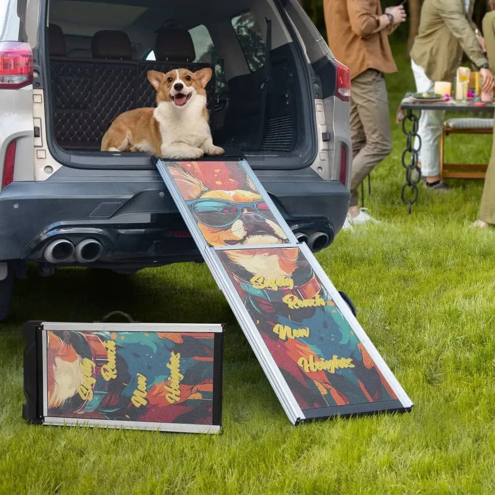 Our dog car ramp is 61" long and only 31" when folded. After folding, the compact collapsible pet ramp can be easily put in your wardrobe or car trunk.